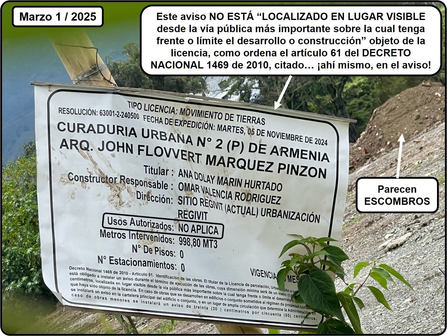 El director del departamento administrativo de planeación de la alcaldía de Armenia Diego Ramírez subrayó que “A hoy evidenciamos con una nueva visita que se siguieron las actividades de disposición en este sitio, toda vez que continuaron las quejas de los vecinos circundantes y ya con la visita que evidenciamos es que se había generado por las inclemencias del clima procesos de deslizamientos, también arrastre de material por agua lluvias, lo que estaba generando pues una afectación tanto al drenaje cercano, adicional a eso hubo unas afectaciones a los vecinos circundantes.