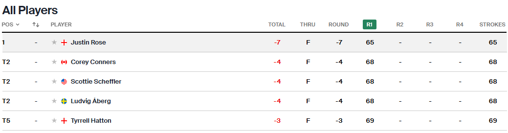 Justin Rose fue el mejor de la jornada inaugural; Scottie Scheffler, defensor del título, lo escolta.