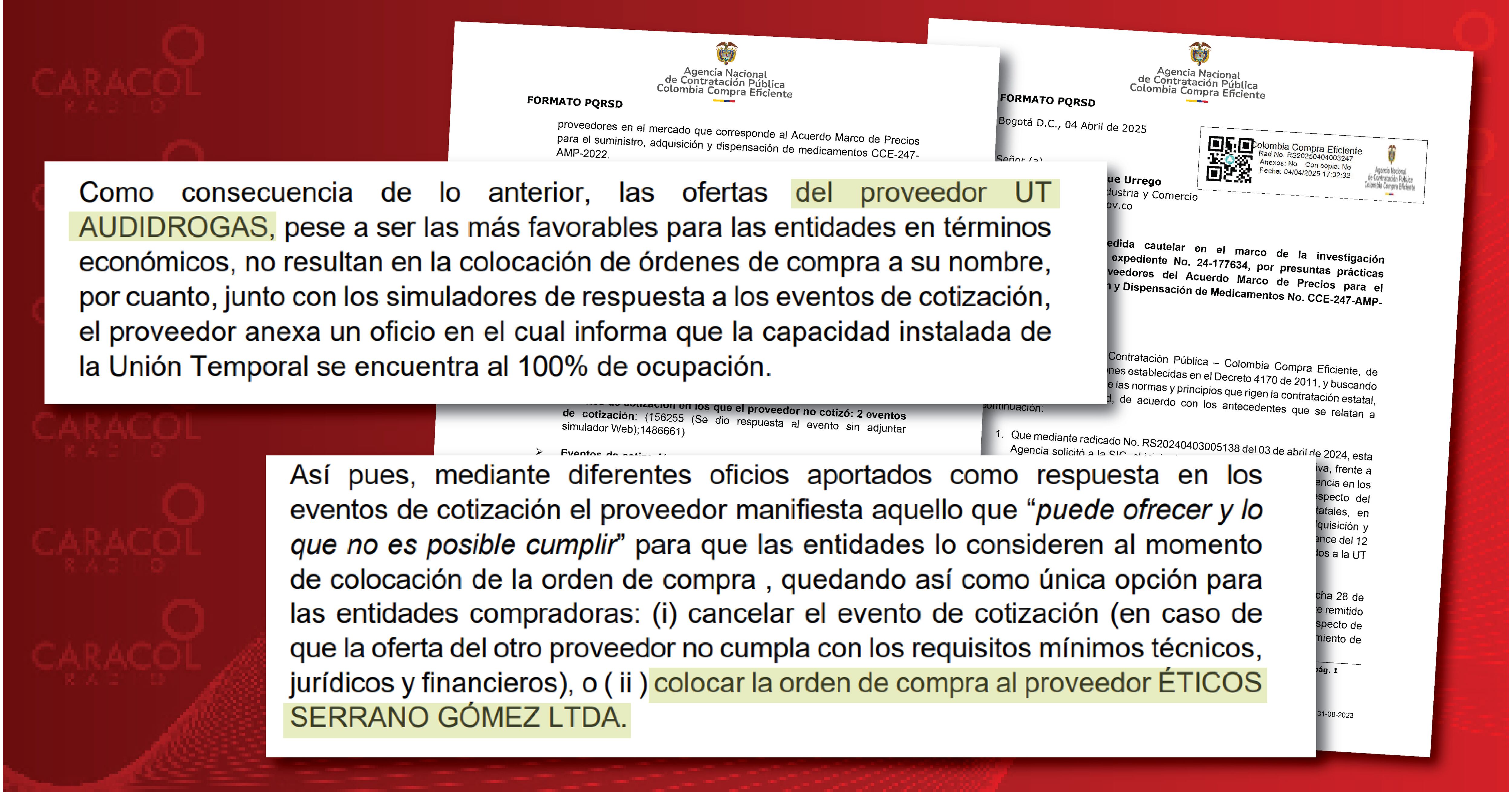 El documento de siete páginas advierte que, la UT Audidrogas y Éticos Serrano Gómez Ltda, se habrían aliado para quedarse como únicos proveedores del Acuerdo Marco de Precios para el suministro y dispensación de medicamentos.