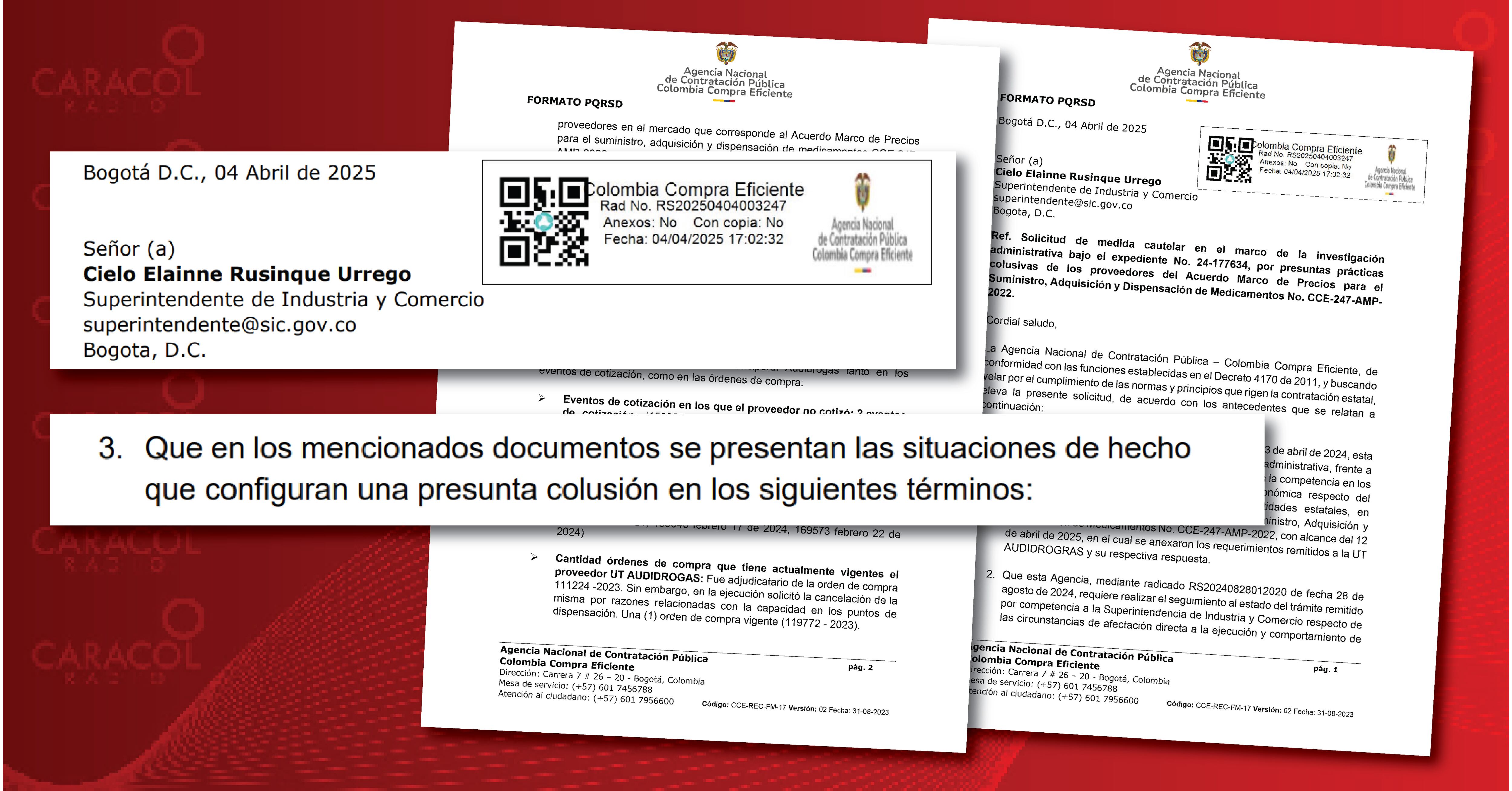 Caracol Radio conoció una queja que Colombia Compra Eficiente radicó el pasado 4 de abril ante la superintendente Cielo Rusinque. (ver documento)