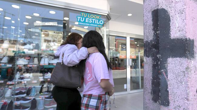 MEX8260. CIUDAD JUÁREZ (MÉXICO), 31/03/2025.- Dos mujeres caminan junto a una cruz que representa personas desaparecidas este domingo, en una calle de Ciudad Juárez, Chihuahua (México). Organizaciones mexicanas que defienden mujeres y niños alertan del aumento de casos de trata de personas y pornografía infantil en Ciudad Juárez después de que la Comisión Estatal de los Derechos Humanos (CEDH) reportó que en esta urbe fronteriza criminales están presuntamente vendiendo niñas. EFE/ Luis Torres / Luis Torres (EFE)