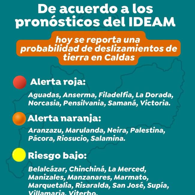 En alerta naranja están los municipios de Aránzazu, Marulanda, Neira, Palestina, Pácora, Riosucio y Salamina y en Naranja por temas relacionados a los derrumbes y en alerta amarilla están Belalcázar, Chinchiná, Manizales, La Merced, Manzanares, Marmato, Marquetalia , Risaralda, San José, Supía, Villamaría y Viterbo