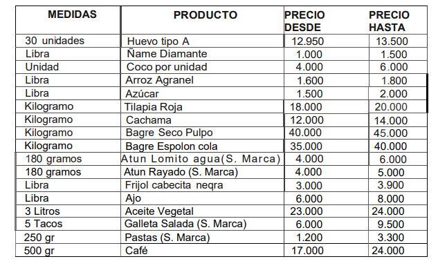 La tabla completa incluye también aceite, café, ajo y atún enlatado. Los comercios podrán vender por debajo del precio mínimo, pero no podrán superar los máximos, so pena de sanciones bajo el Estatuto del Consumidor (Ley 1480 de 2011).