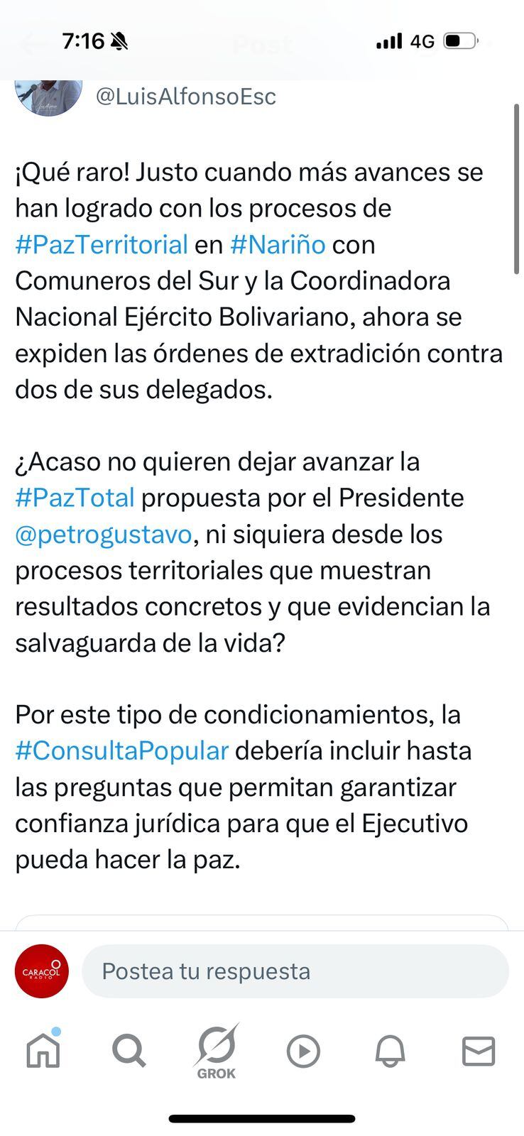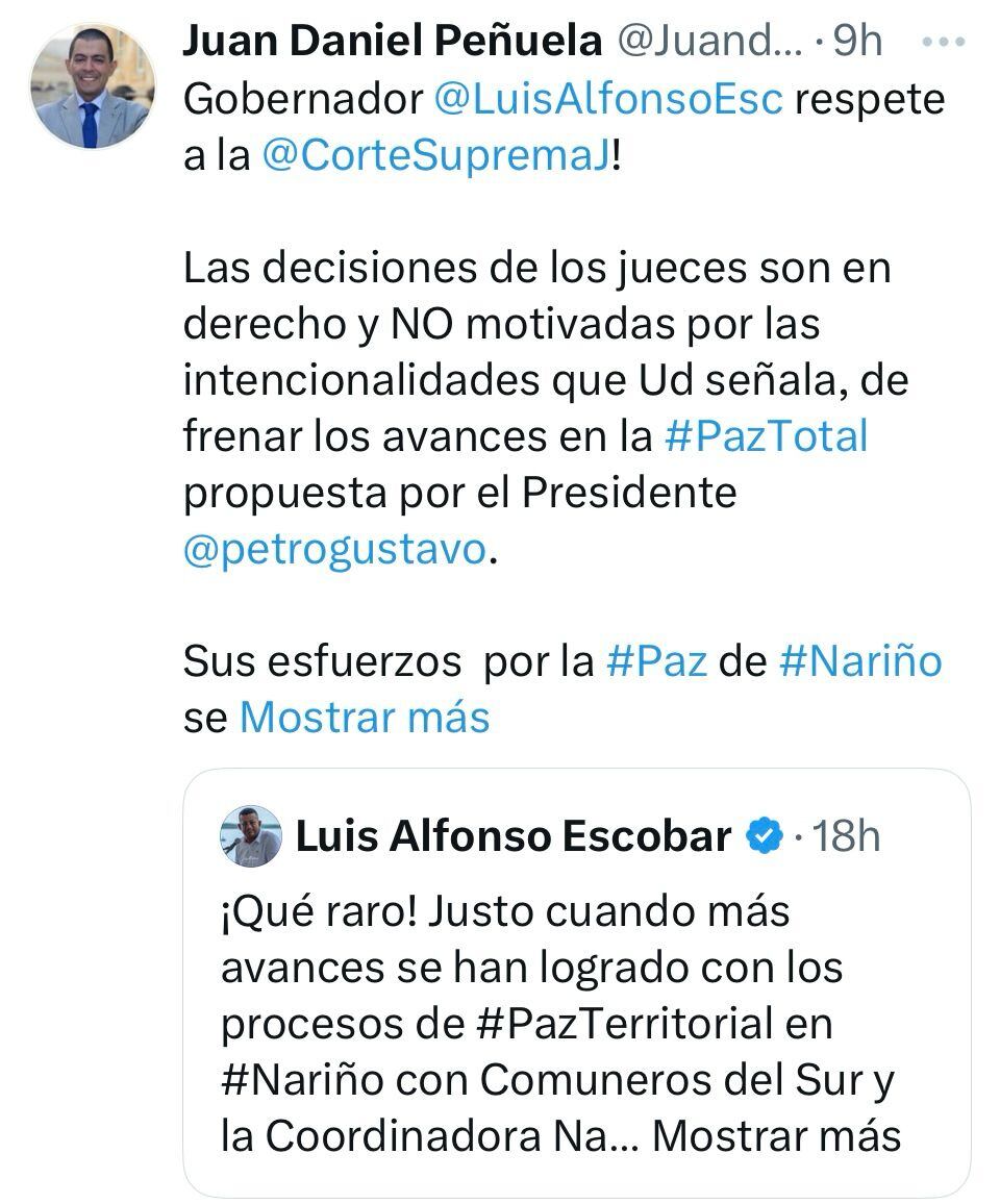 Peñuela ha sido un duro critico de este proceso, en las últimas horas en su cuenta de X ante los cuestionamientos del gobernador de Nariño Luis Alfonso Escobar a la posibilidad de que se extradite a delegados de Comuneros del Sur y la Coordinadora Nacional Ejército Bolivariano y la obstrucción que esto representaría al proceso de paz total, el congresista respondió: “Gobernador respete a la Corte Suprema. Las decisiones de los jueces son en derecho y no motivadas por las intencionalidades que ud señala, de frenar los avances en la Paz total propuesta por el Presidente Gustavo Petro”