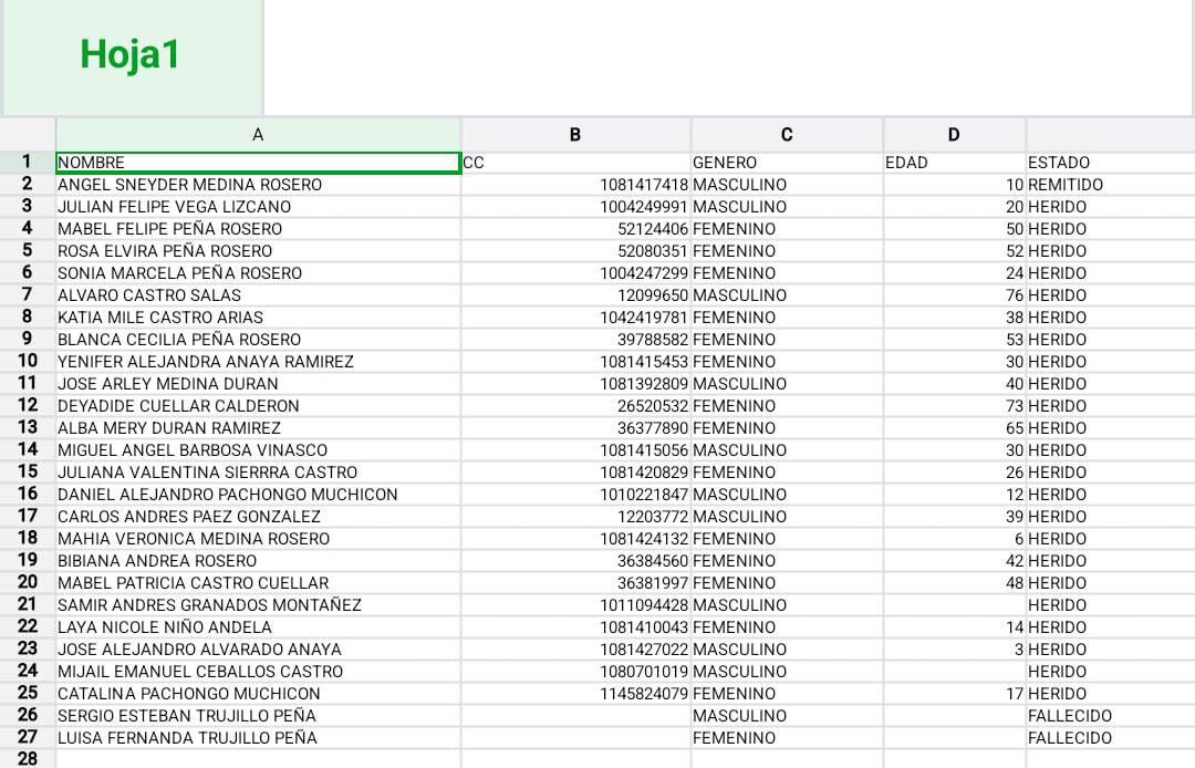 24 personas heridas, entre ellas 11 mujeres, siete hombres y seis niños. El siguiente es el listado de heridos y personas fallecidas..