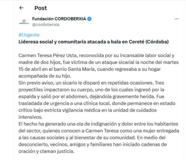 Indignación y dolor ha causado en Córdoba el vil ataque que recibió Carmen Teresa Pérez Usta, reconocida por su incansable labor social y comunitaria.