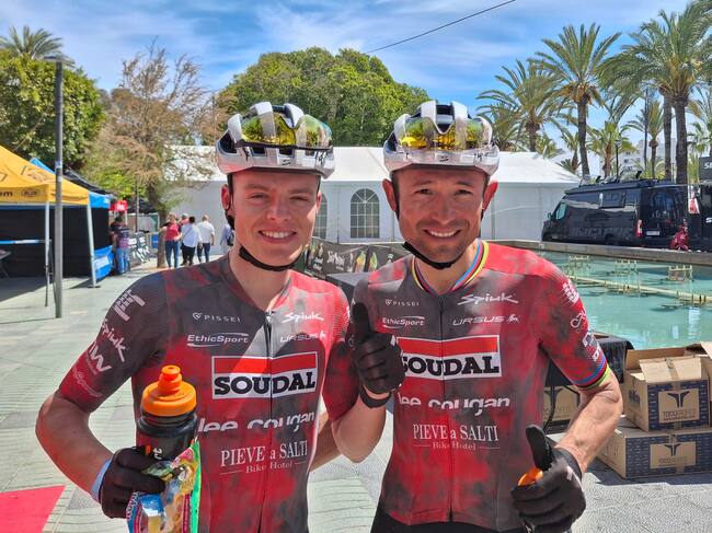 Sant Antoni de Portmany (Ibiza), 18/04/2025.- La pareja formada por el colombiano Héctor Leonardo Páez (d), exdoble campeón del mundo, y el italiano Dario Cherchi (i) consiguieron el maillot de líderes tras una gran exhibición en la primera etapa de la Vuelta a Ibiza MTB Siroko by Shimano, disputada con intenso calor con salida en la capital ibicenca y llegada en Sant Antoni, de 67 km y 2.100 metros de desnivel. EFE/Carlos De Torres / Carlos de Torres (EFE)