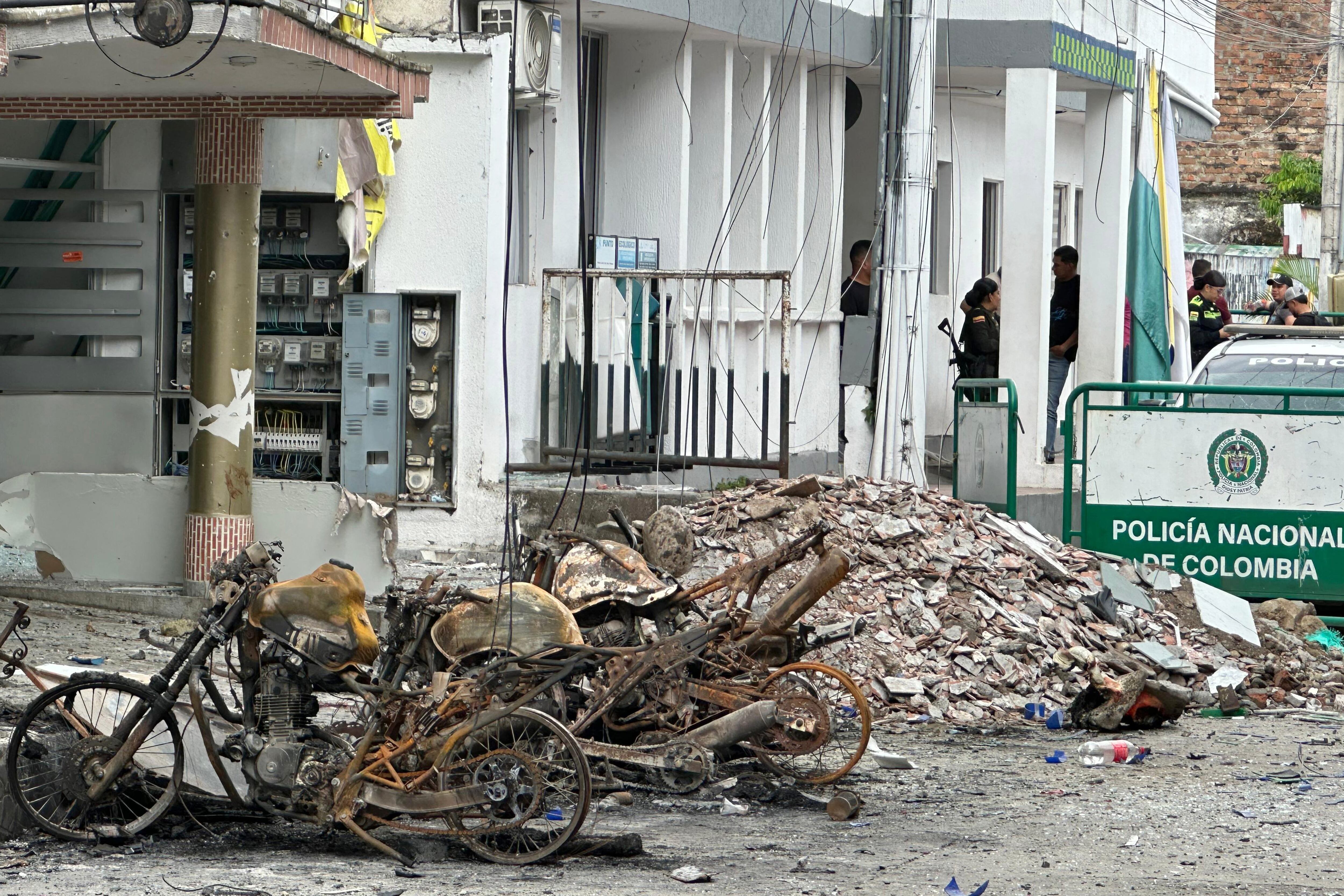 AME491. LA PLATA (COLOMBIA), 18/04/2025.- Fotografía cedida por el Diario La Nación de Neiva que muestra parte de los destrozos este viernes, que dejó un ataque con explosivos a una estación de Policía en La Plata (Colombia). Dos jóvenes hermanos de 17 y 19 años de edad fueron las víctimas mortales de la explosión de una bomba la noche del Jueves Santo frente al puesto de Policía de La Plata, en el sureño departamento colombiano del Huila, ataque que dejó también más de 20 heridos. EFE/ Diario La Nación de Neiva /SOLO USO EDITORIAL/SOLO DISPONIBLE PARA ILUSTRAR LA NOTICIA QUE ACOMPAÑA (CRÉDITO OBLIGATORIO) / Diario La Nación de Neiva