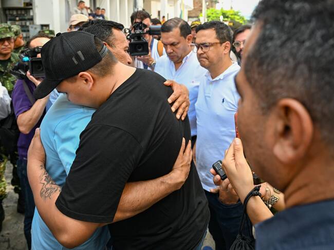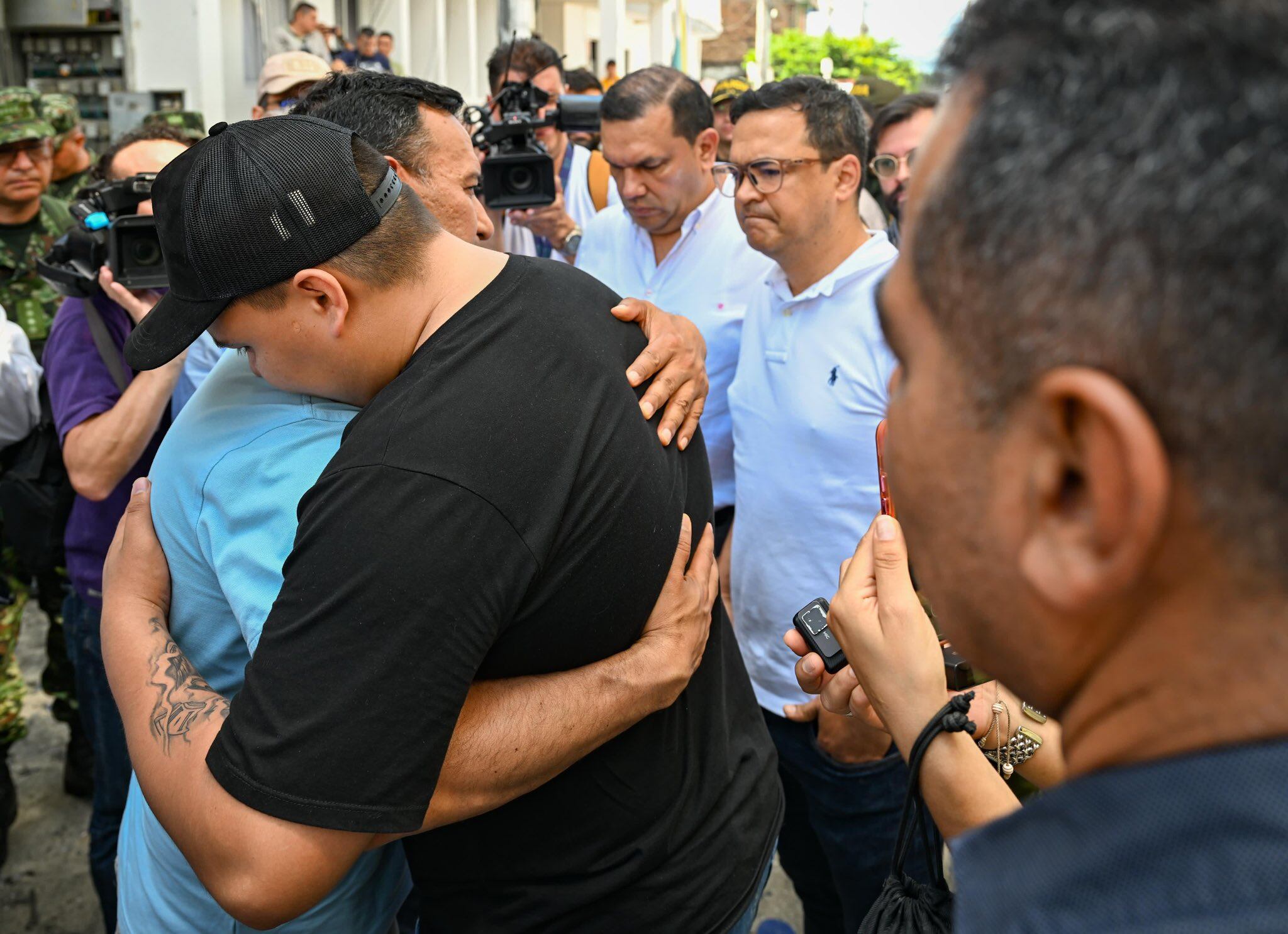Ministro Pedro Sánchez abrazando a Jesús, hermano de los dos jóvenes muertos en atentado en La Plata, Huila.