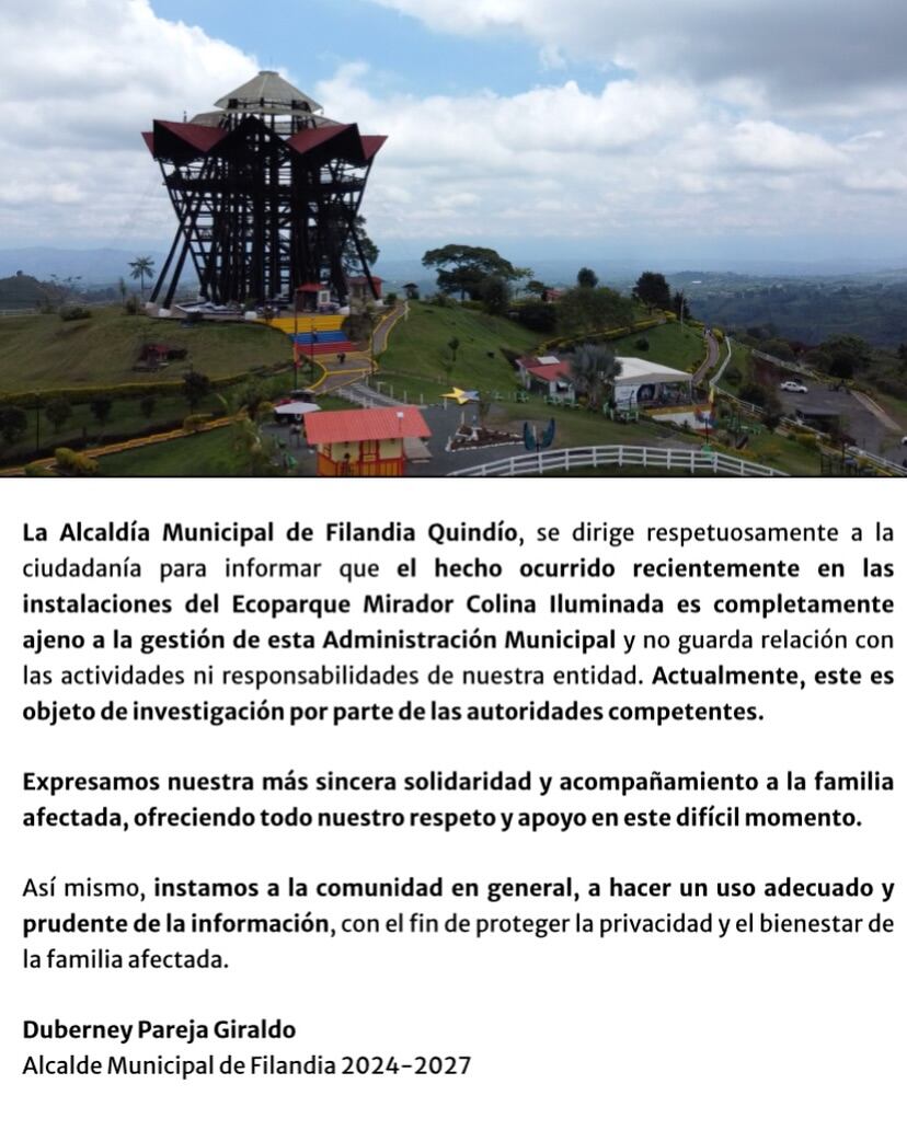 El secretario del Interior del Quindío, Jaime Andrés Pérez expresó “Culminando ya la Semana Santa, recibimos una información donde un ciudadano de 69 años, llamado Carlos Alberto Herrera Salazar, se lanza desde el último piso del Mirador de la colina Iluminada del municipio de Filandia, allí la patrulla, la policía de reacción y al llegar al lugar encuentran que la persona había fallecido.