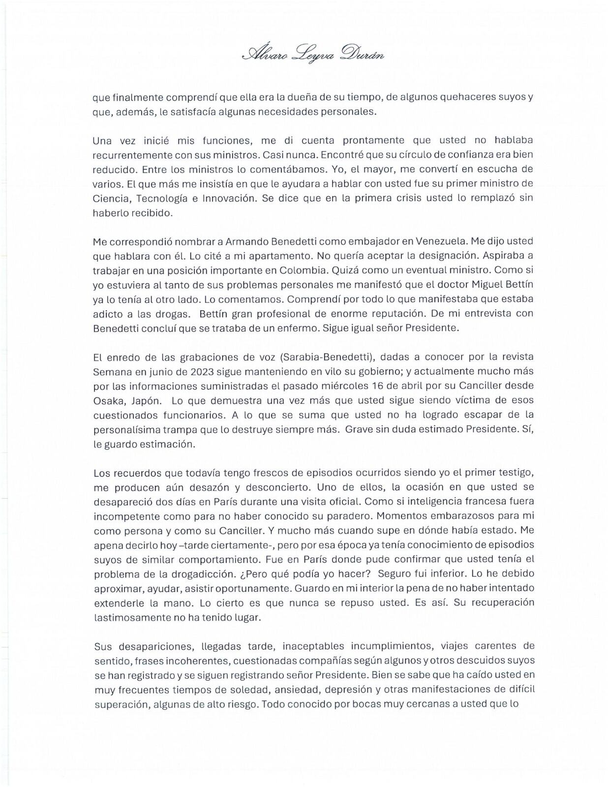El excanciller de la República Álvaro Leyva publicó en la mañana de este miércoles, 23 de abril, una dura carta que envió al presidente Gustavo Petro y en la que tocó varios temas, entre ellos el conflicto entre Laura Sarabia y Armando Benedetti, desapariciones del mandatario en Francia y un problema de “drogadicción”.
