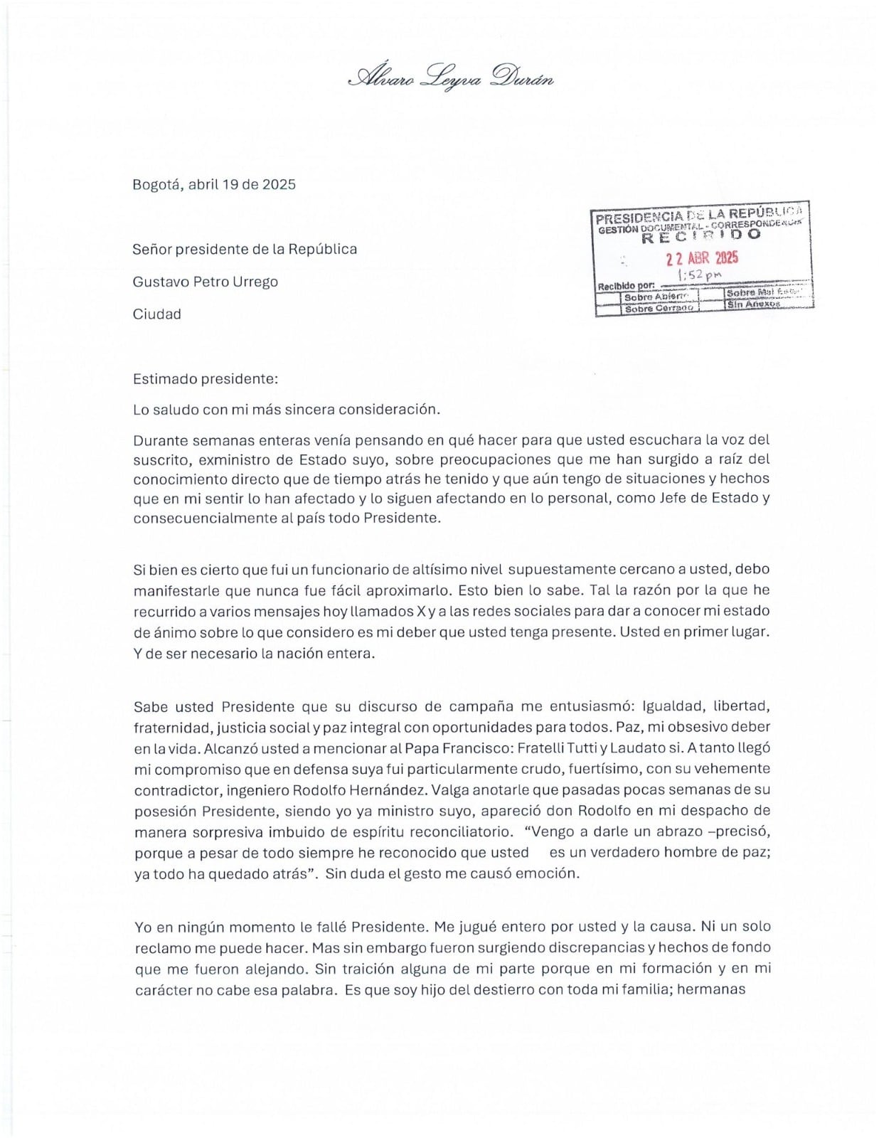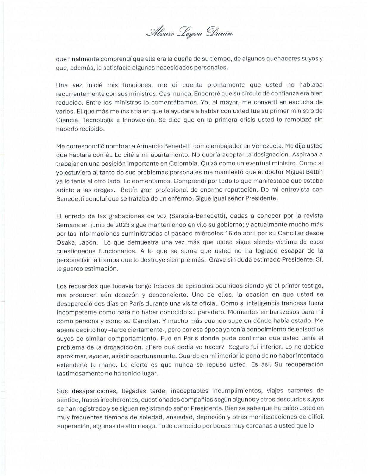 Este miércoles 23 de abril, el excanciller Álvaro Leyva publicó una dura carta que envió al presidente Gustavo Petro en la que abordó varios temas como el conflicto entre Laura Sarabia y Armando Benedetti, las desapariciones del mandatario en Francia y su presunto problema de “drogadicción”.