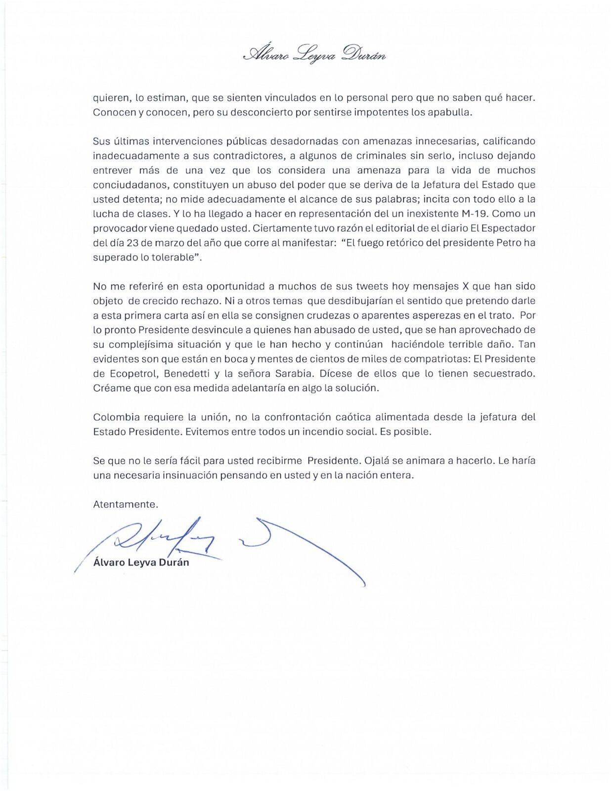Esta es la carta del excanciller Álvaro Leyva al presidente Gustavo Petro: