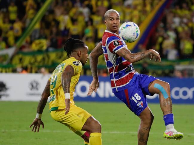Aldair Gutiérrez (i) de Bucaramanga disputa el balón con Deyverson de Fortaleza este miércoles, en un partido de la fase de grupos de la Copa Libertadores en el estadio Américo Montanini en Bucaramanga (Colombia). EFE/ Carlos Ortega / Carlos Ortega (EFE)