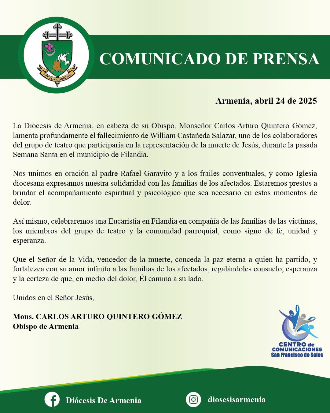 Comunicado Diócesis de Armenia. Foto Cortesía Diócesis de Armenia