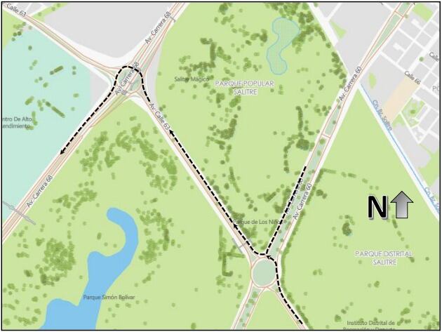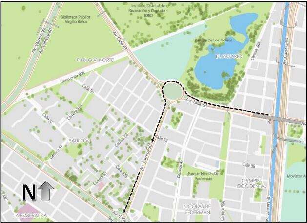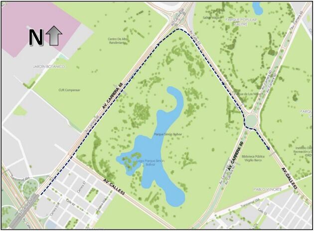 • Calzada Occidental de la Carrera 60 entre la Av. Calle 63 y la Av. Calle 26: cierre total desde las 9:00 am hasta las 10:40 am.