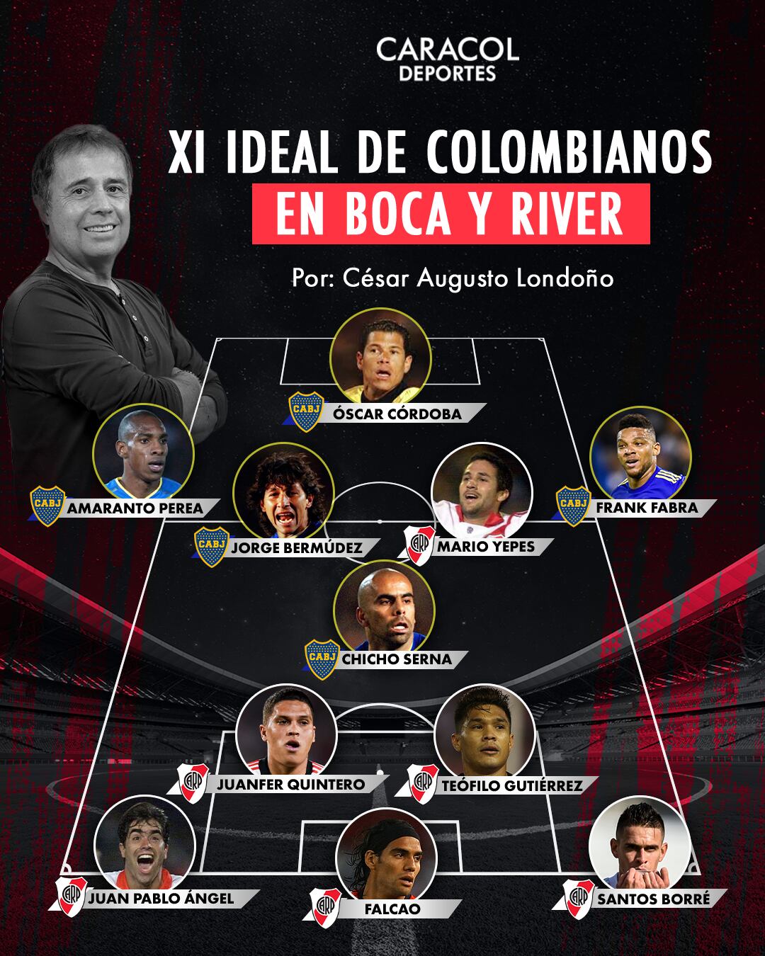 El director de El Pulso del Fútbol y La Polémica, César Augusto Londoño, elaboró un once histórico con los jugadores colombianos con mayor protagonismo en River como en Boca, estos son los elegidos: Córdoba; Amaranto, Bermúdez, Yepes, Fabra; Chicho, Quintero, Teo; Borré, Falcao, Ángel.