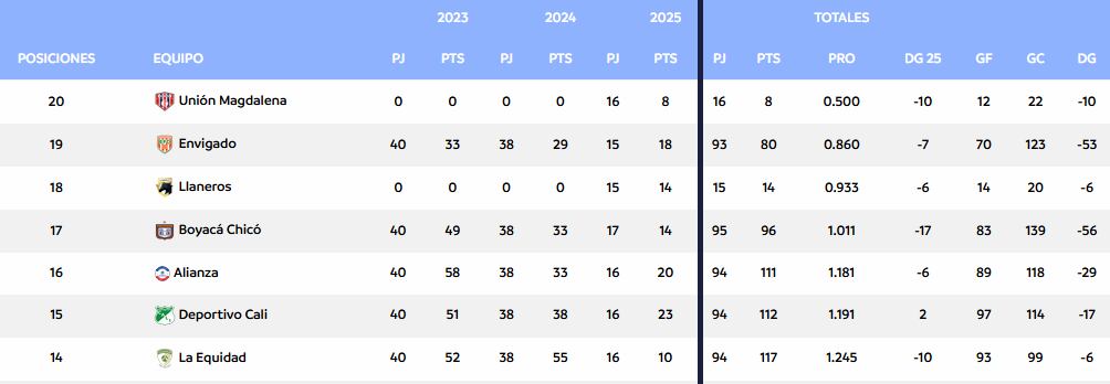 Justamente sobre la permanencia en la primera categoría, es pertinente aclarar que, a día de hoy, los dos equipos que están perdiendo su lugar en la Liga para la temporada 2026 son Unión Magdalena y Envigado.