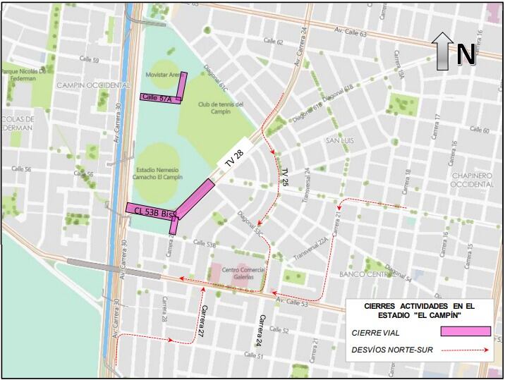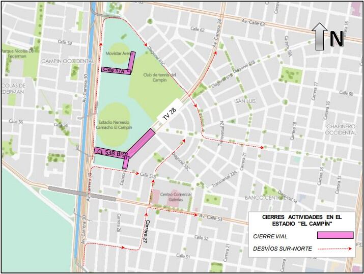 - Cierre total de las dos calzadas de la transversal 28 entre la carrera 28 y la Av. Calle 57 incluido el sendero peatonal del costado Occidental.
