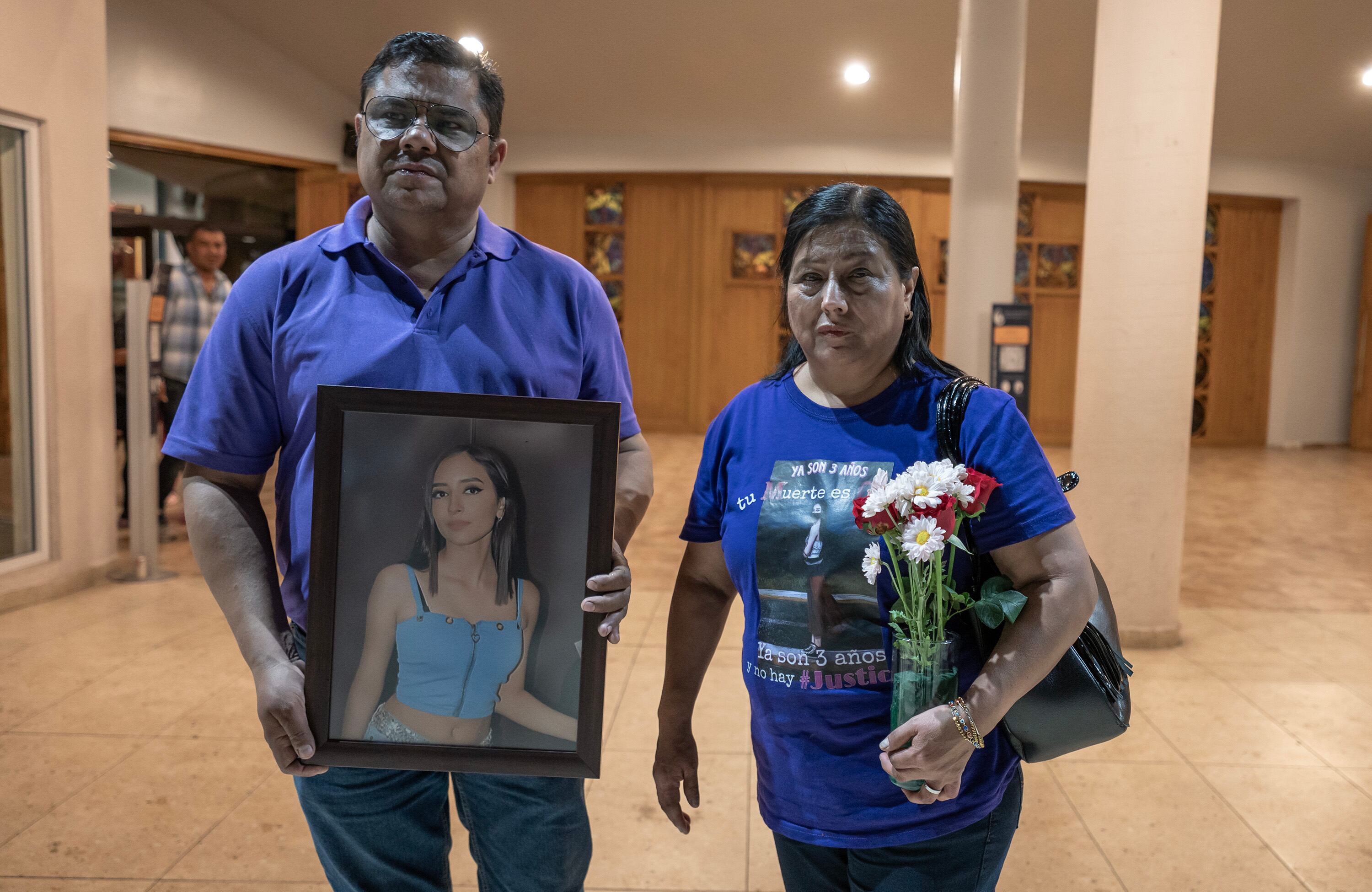 MEX608. MONTERREY (MEXICO), 21/04/2025.- Mario Escobar (i) y Dolores Bazaldua, participan junto con familiares y amigos en una misa en memoria por el tercer aniversario del asesinato de su hija Debanhi Escobar, este lunes en Monterrey (México). Los padres de la mexicana Debanhi Susana Escobar Bazaldúa, cuya desaparición y feminicidio hace tres años acapararon la atención internacional, aseguraron este lunes que están dispuestos a llevar el caso ante organismos internacionales si en México no se hace justicia en el caso de su hija. EFE/Miguel Sierra / Miguel Sierra