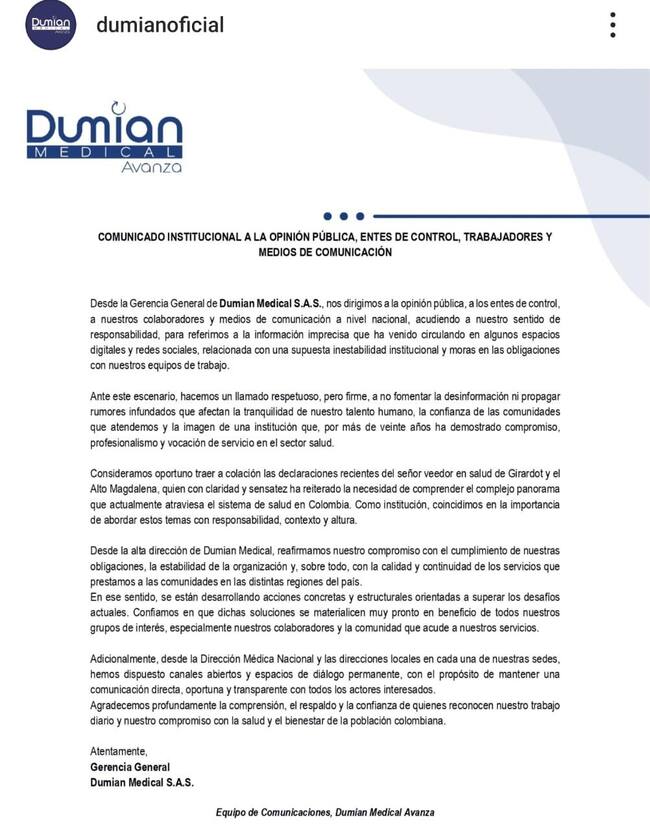 A través de un comunicado que les llegó a los trabajadores de la clínica, las directivas señalan que hay desinformación y rumores infundados frente al pago de sus responsabilidades con los colaboradores, y que la situación del sistema de salud tiene que ver con lo que está pasando con la entidad, pero se comprometen a buscar soluciones.