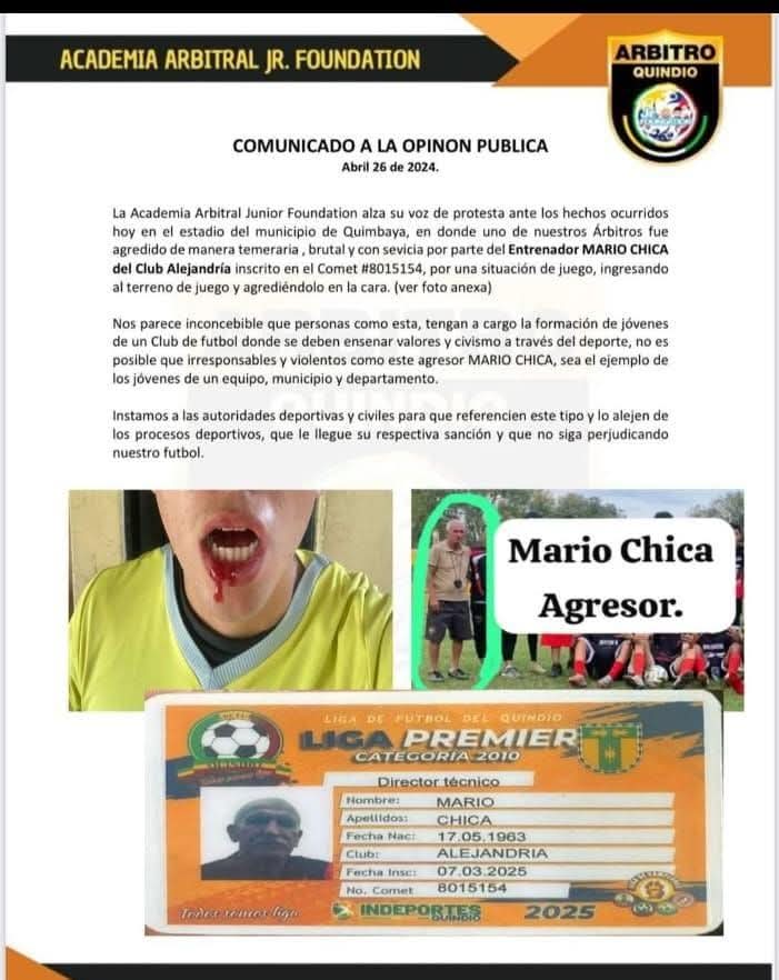 El lamentable caso se registró en el estadio municipal mientras se jugaba un partido de liga de la categoría sub 15 entre los equipos Club Alejandría de Quimbaya y Atlético de Armenia cuando por una decisión de expulsión el entrenador de uno de los equipos la emprende contra el árbitro quien resulta lesionado.