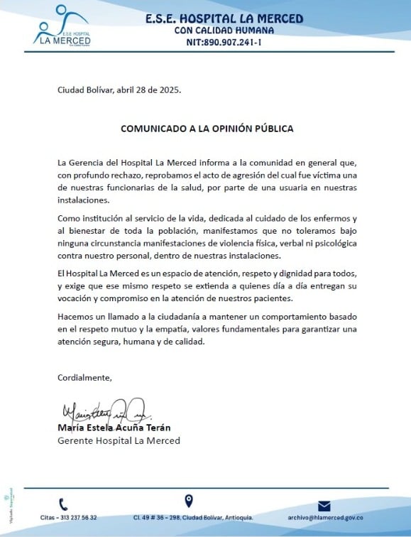 Una mujer agredió a una enfermera en el hospital La Merced de Ciudad Bolívar, Antioquia