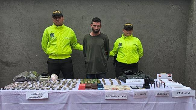 En la diligencia fueron incautados, dos teléfono celulares, seis panfletos alusivos al ELN, siete cartuchos calibre 7.62 mm, 2.300 gramos de marihuana, 01 gramera, 01 radio de comunicaciones, 01 chaqueta de uso privativo de las fuerzas militares, la suma de 1.197.900 mil pesos en moneda colombiana y 100 bolsas Ziploc para dosificación del estupefaciente.