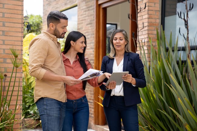 Real estate agent showing pictures of a house to a couple using a digital tablet - house rental concepts / andresr