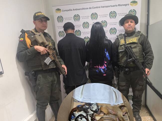 En el aeropuerto internacional José María Córdova de Rionegro fueron capturadas dos personas por los delitos de maltrato animal, tráfico de fauna silvestre y aprovechamiento ilícito de los recursos naturales. Los judicializados son una mujer y un hombre que pretendían salir del país con seis espacies, algunas en peligro de extinción.