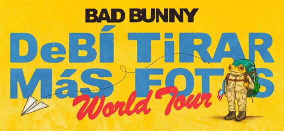 Tras el éxito sin precedentes de su aclamado álbum, el tres veces ganador del GRAMMY® y once veces ganador del Latin GRAMMY®, Bad Bunny, ha anunciado su gira mundial “DeBÍ TiRAR MáS FOToS World Tour”.