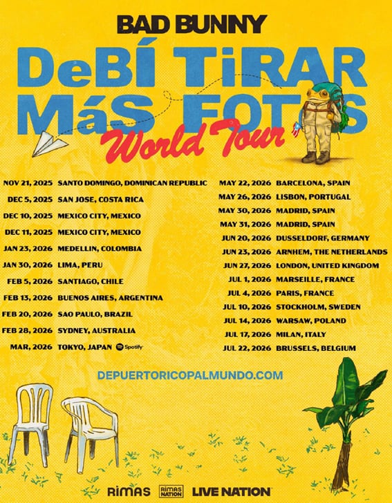 La gira “DeBÍ TiRAR MáS FOToS World Tour” dará vida al álbum, sumergiendo completamente al público en su universo y celebrando la esencia y la cultura de la herencia puertorriqueña de Bad Bunny.