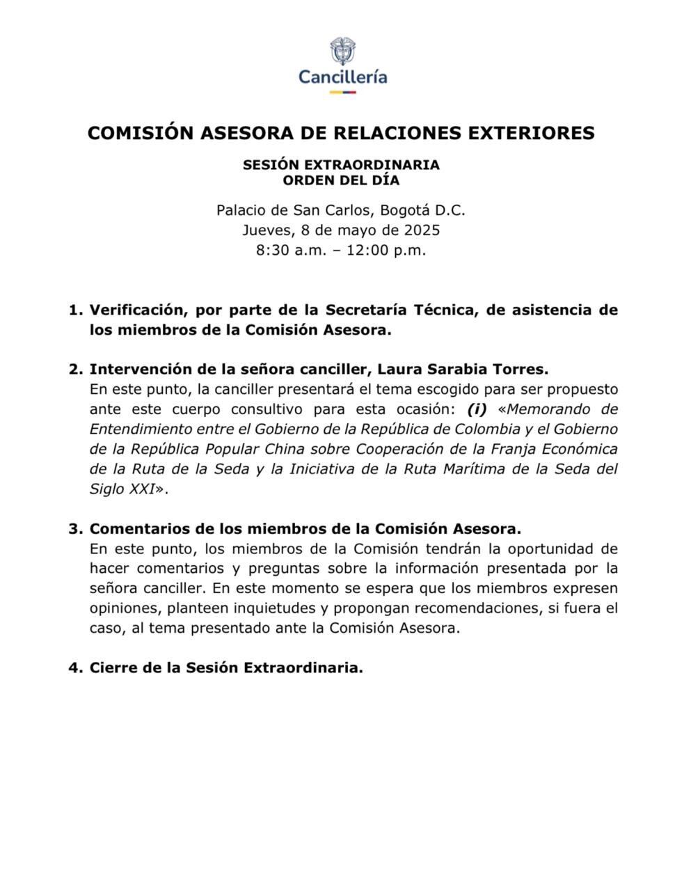 El encuentro, que tendrá lugar en el Palacio de San Carlos en Bogotá, abordará un único punto: la discusión sobre el memorando de entendimiento entre Colombia y China para la cooperación en el marco de la Franja Económica de la Ruta de la Seda y la Iniciativa de la Ruta Marítima del Siglo XXI.