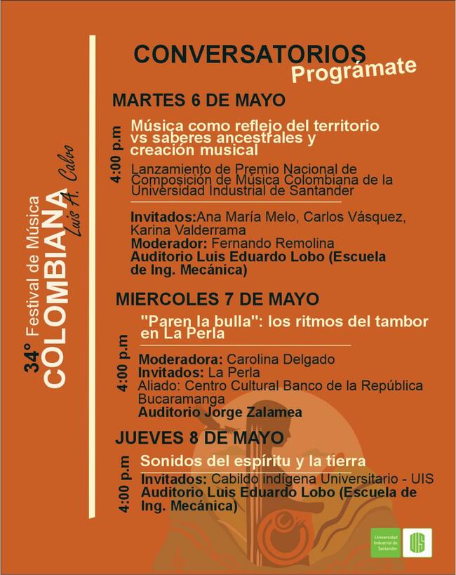 Los conversatorios se realizan a las 4:00 p.m. en distintos auditorios de la universidad. Hoy martes se lleva a cabo el panel “Música como reflejo del territorio vs saberes ancestrales y creación musical”, el miércoles 7 el encuentro “Paren la bulla: los ritmos del tambor en La Perla”, y el jueves 8, “Sonidos del espíritu y la tierra”, con participación del Cabildo Indígena Universitario.