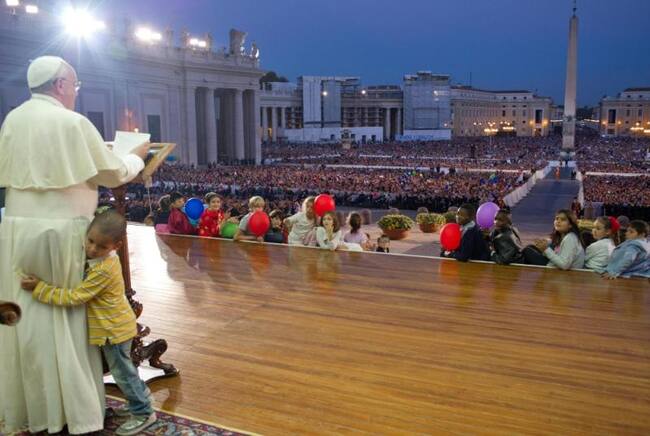 El niño se subió al escenario para abrazar al papa Francisco durante su intervención en la Fiesta de la Familia que se celebró este, 26 de octubre de 2013, en la Plaza de San Pedro, en el Vaticano. Foto: Efe