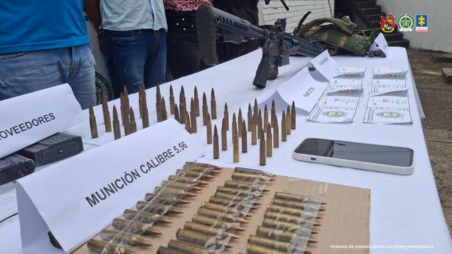 Durante labores de allanamiento fueron incautados un fusil M4 calibre 5.56 milímetros, un proveedor y 56 cartuchos para el mismo, un chaleco multipropósito, un celular y panfletos citatorios del frente Iván Díaz.