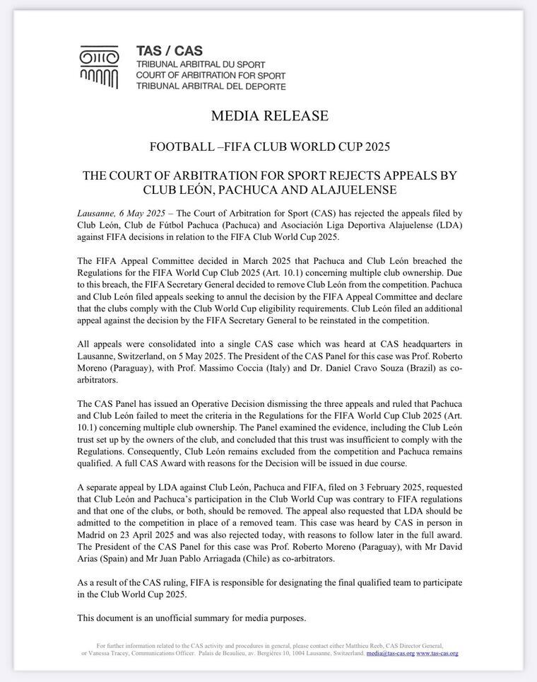 "El Tribunal de Arbitraje Deportivo (TAS) rechazó las apelaciones interpuestas por el Club León, el Club de Fútbol Pachuca (Pachuca) y la Asociación Liga Deportiva Alajuelense (LDA) contra las decisiones de la FIFA en relación con la Copa Mundial de Clubes de la FIFA 2025. La Comisión de Apelación de la FIFA decidió en marzo de 2025 que Pachuca y el Club León incumplieron el Reglamento de la Copa Mundial de Clubes de la FIFA 2025 (Art. 10.1) relativo a la propiedad múltiple de clubes“, informó el TAS.