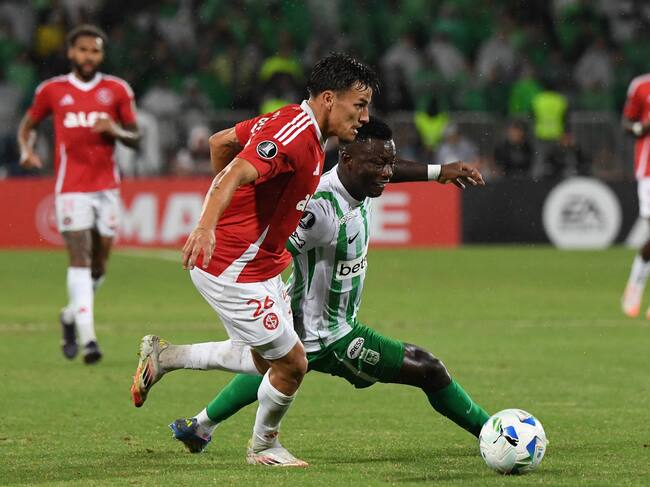Internacional's Argentine defender #26 Alexandro Bernabei and Atletico Nacional's forward #18 Marino Hinestroza fight for the ball during the Copa Libertadores group stage first round football match between Colombia's Atletico Nacional and Brazil's Internacional at the Atanasio Girardot stadium in Medellin, Antioquia department, Colombia, (Photo by Jaime SALDARRIAGA / AFP) (Photo by JAIME SALDARRIAGA/AFP via Getty Images) / JAIME SALDARRIAGA