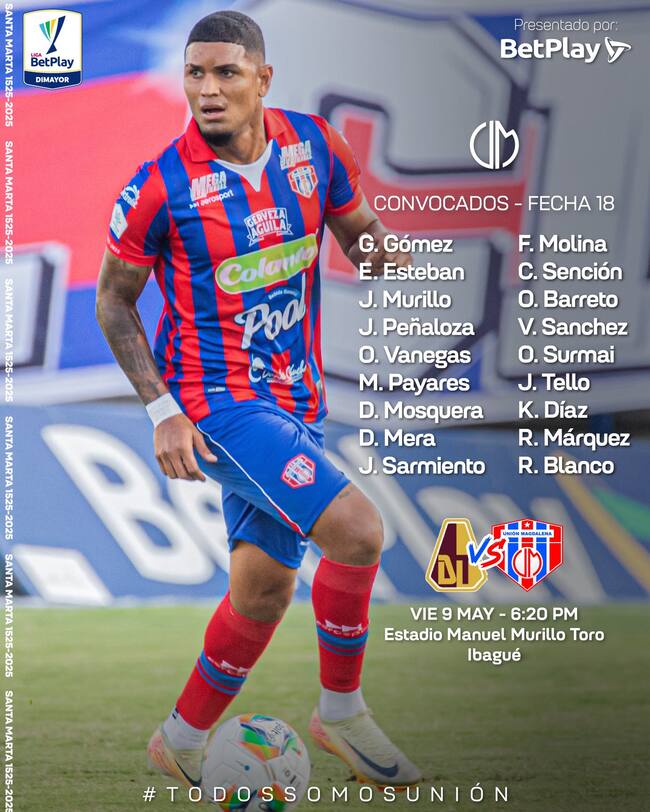 Deportes Tolima derrotó 3-1 a Unión Magdalena en la apertura de la fecha 18 de la Liga Colombiana, con doblete de Kevin Pérez en el primer tiempo, y un tanto de Brayan Rovira (90+2). Jannenson Sarmiento marcó el descuento para la Unión, en el partido que se disputó en el Estadio Manuel Murillo Toro de Ibagué, bajo la orden del árbitro central, Luis Delgado.