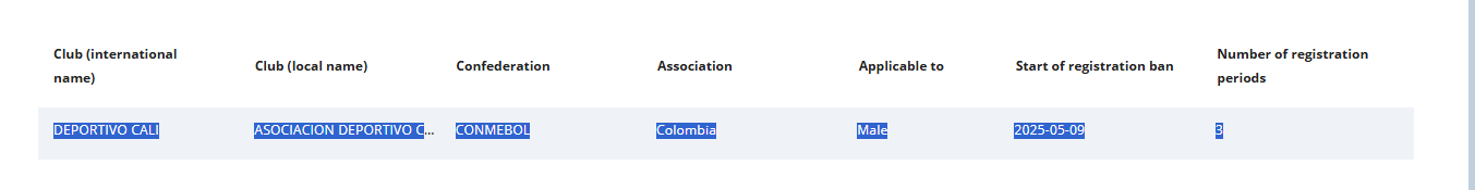 Este viernes 9 de mayo, se conoció que la FIFA, en su sitio web de registro de prohibición de registros, decidió prohibirle al Deportivo Cali la inscripción de jugadores por los próximos tres periodos de mercado de fichajes. Lo anterior, sería partiendo de una demanda que impuso el jugador paraguayo Gustavo Adrián Ramírez al club por incumplimiento de pagos, la cual fue ganada por el futbolista.