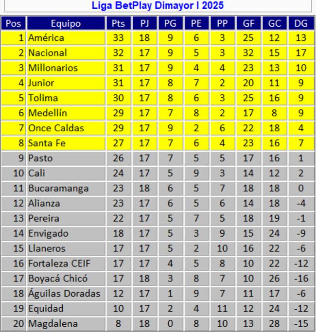El Embajador, tras su reciente empate 0-0 con Deportivo Pereira, aseguró su tiquete en los cuadrangulares finales del campeonato, es tercero con 31 puntos. Por su parte, los dirigidos por Hernán Darío Herrera están en la séptima casilla y han sumado 29 puntos, recordemos que la Dimayor le dio la victoria a Once Caldas antes Unión Magdalena por los hechos violentos ocurridos en el estadio Sierra Nevada.