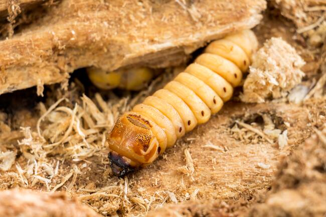 Beetle Worm of Scarab Beetle is dangerous insect pest with Mango tree borer. Batocera rufomaculata for eating as food edible insects, it is good source of protein. Environment and Entomophagy concept. / ARISA THEPBANCHORNCHAI