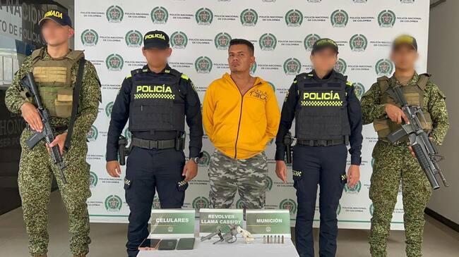 Asegura la Policía que, durante la diligencia de registro y allanamiento , en la que fue capturado, le hallaron en su poder un revólver calibre 38 milímetros, 06 cartuchos calibre 38 milímetros y 03 celulares.