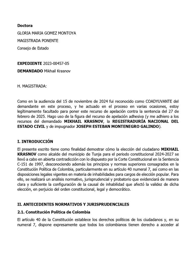 coadyuvante en el proceso de nulidad electoral, presentó ante el Consejo de Estado un recurso de apelación adhesiva contra la sentencia que no anuló la elección de Mikhail Krasnov