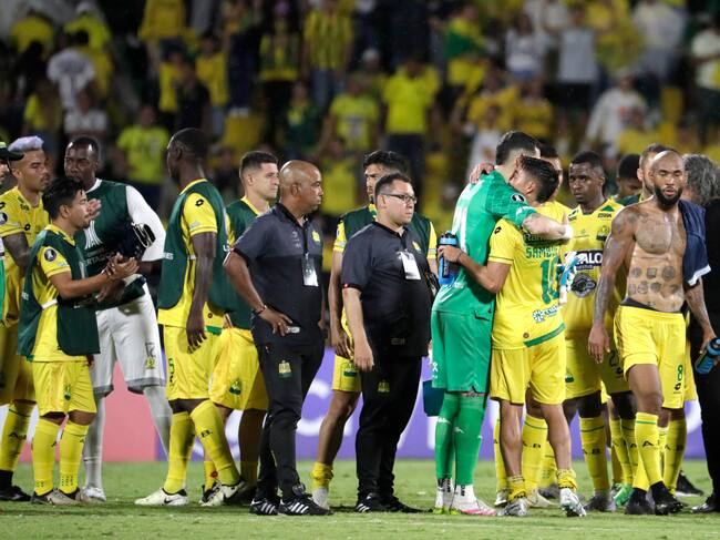 AMDEP5914. BUCARAMANGA (COLOMBIA), 06/05/2025.- Jugadores de Bucaramanga reaccionan este martes, en un partido de la fase de grupos de la Copa Libertadores entre Atlético Bucaramanga y Racing, en el estadio Américo Montanini en Bucaramanga (Colombia). EFE/ Carlos Ortega / Carlos Ortega (EFE)