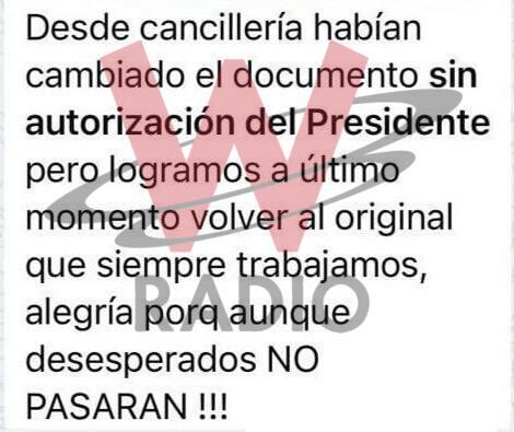 “Desde Cancillería habían cambiado el documento sin autorización del presidente, pero logramos, a último momento, volver al original que siempre trabajamos. Alegría porque, aunque desesperados, ¡NO PASARÁN!”, se lee.
