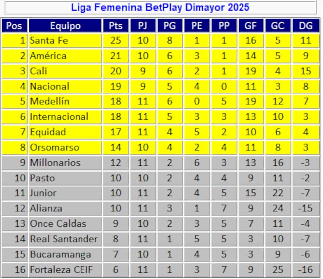 Luego de 11 fechas, Independiente Santa Fe es líder con 25 puntos, acumulando ocho victorias, en el segundo lugar se en encuentra América con 21 puntos y el tercer lugar es para Deportivo Cali con 20 unidades.