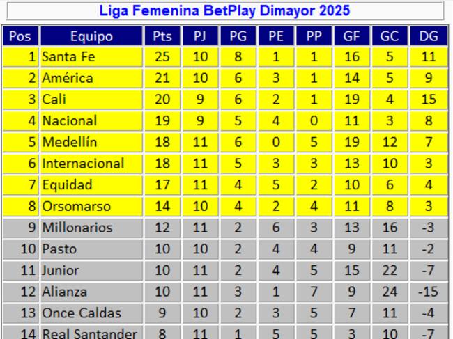 Luego de 11 fechas, Independiente Santa Fe es líder con 25 puntos, acumulando ocho victorias, en el segundo lugar se en encuentra América con 21 puntos y el tercer lugar es para Deportivo Cali con 20 unidades.