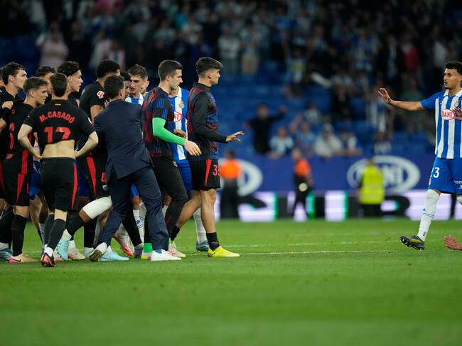 CORNELLÁ (BARCELONA), 15/05/2025.- Los jugadores del Espanyol se encaran con los del FC Barcelona al finalizar el encuentro correspondiente a la jornada 36 de LaLiga EA Sports que RCD Espanyol y FC Barcelona disputaron este jueves en el RCDE Stadium, en Cornellá de Llobregat, Barcelona. EFE/Enric Fontcuberta / Enric Fontcuberta (EFE)