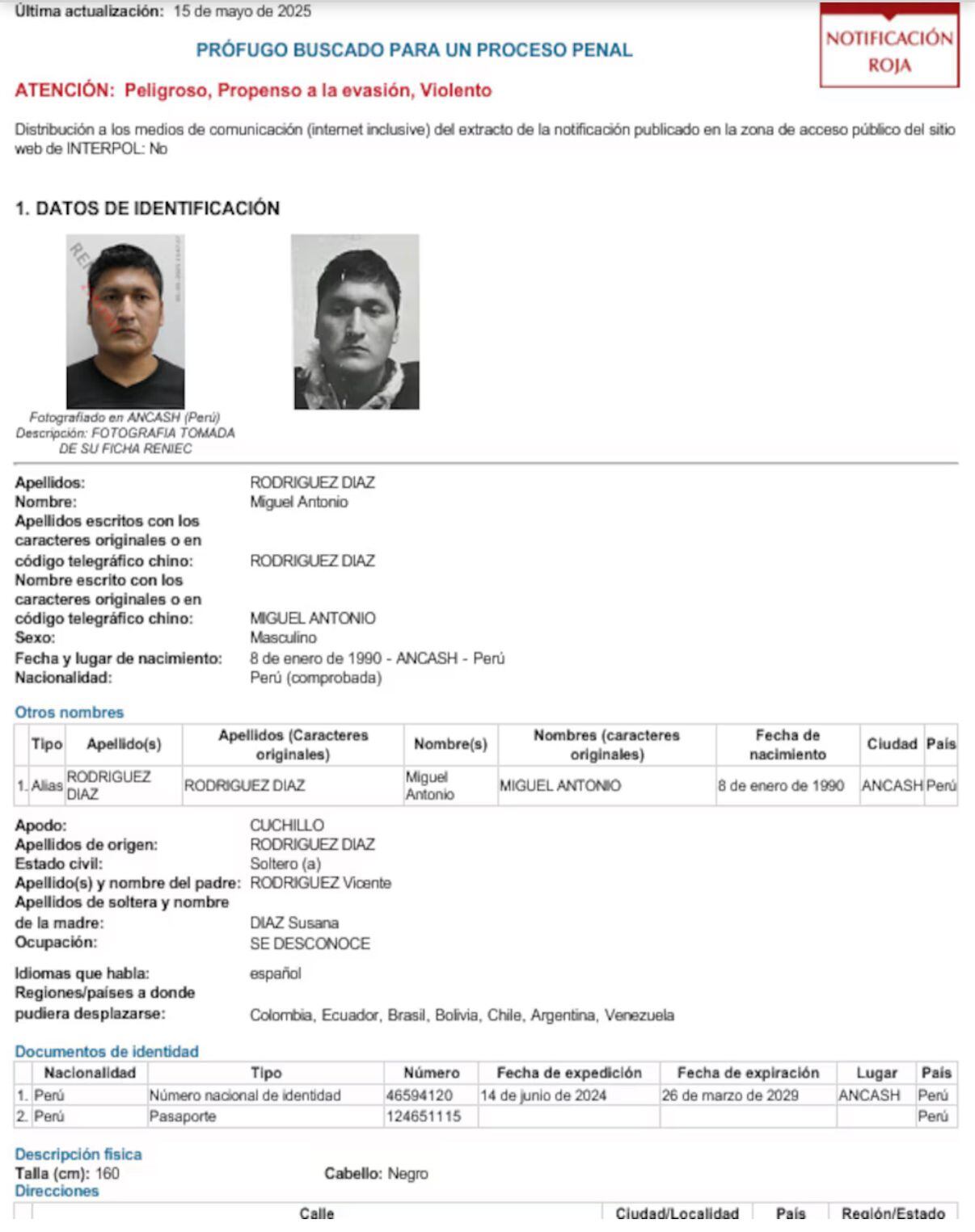 En la notificación roja de Interpol, se señala que Rodríguez habría ordenado a 20 hombres armados irrumpir violentamente en el interior de una mina en Pataz para robar mineral extraído.